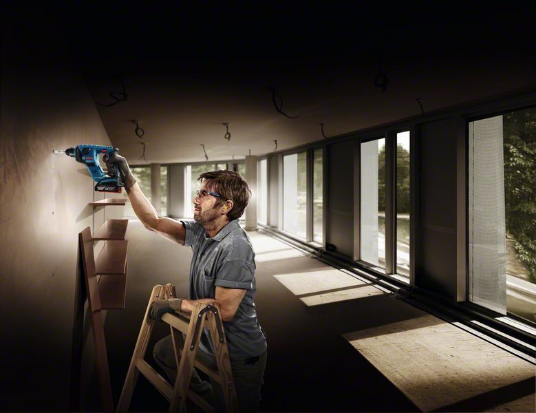 Акумуляторний перфоратор Bosch GBH 18 V-LI Compact – потужний інструмент від компанії Bosch. Його можна прирівняти за потужністю до мережного. Це оптимальний варіант для роботи у будь-якому приміщенні. Вага перфоратора невелика, лише 1.9 кг. При тривалій роботі мінімальний витрат вашої енергії та сил. Для свердління отворів перфоратором у бетоні оптимізований повністю ударний механізм. Акумулятор літій-іонний, ємність акумулятора 2.0 А/год., напруги акумулятора становить 18 В. Хвостовик типу SDS+. Перфоратор чудово і без збоїв працює в двох режимах, свердління і свердління з ударом. Є в наявності реверс. Максимальний діаметр свердління для бетону 12 мм для металу 8 мм, для дерева 16 мм. Кількість ударів інструменту 4950 ударів за хвилину. Відносно невеликі розміри та вага. Вага 2.9 кг, габарити 278 х 219 мм. Для кращої видимості вами робочої зони є світлодіодне підсвічування.
