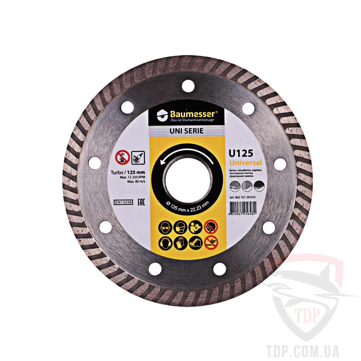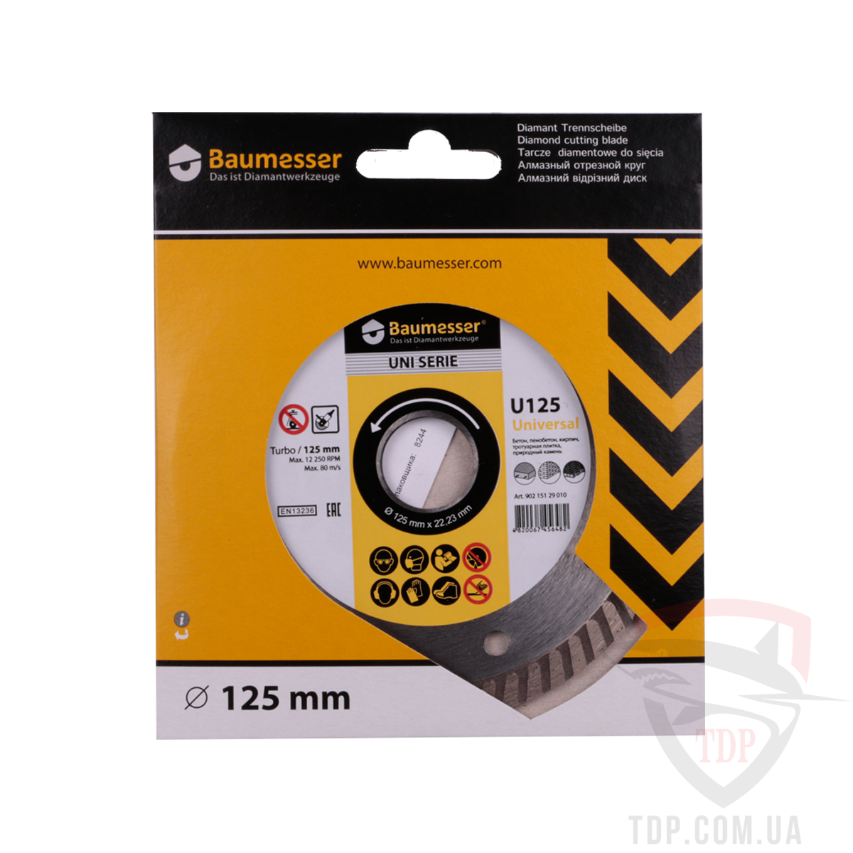 Алмазний диск з бетону Baumesser Turbo Universal 125x22.2 (90215129010) купити по вигідній ціні 298 грн. в магазині інструментів та обладнання ТДП "Трейд Плюс" з доставкою по Києву та всій Україні. Зателефонуйте нашому менеджеру і він запропнує товари із каталогу: чи аналог товару від виробника Baumesser із широкого асортименту продукції. Інтернет магазин ТДП доставить замовлення в Харків, Вінницю, Луцьк. Найкраща пропозиція купити Алмазний диск з бетону Baumesser Turbo Universal 125x22.2 (90215129010) в інтернет-магазині ТДП "Трейд Плюс" просто зателефонувавши нам за номером 0(800)303-900