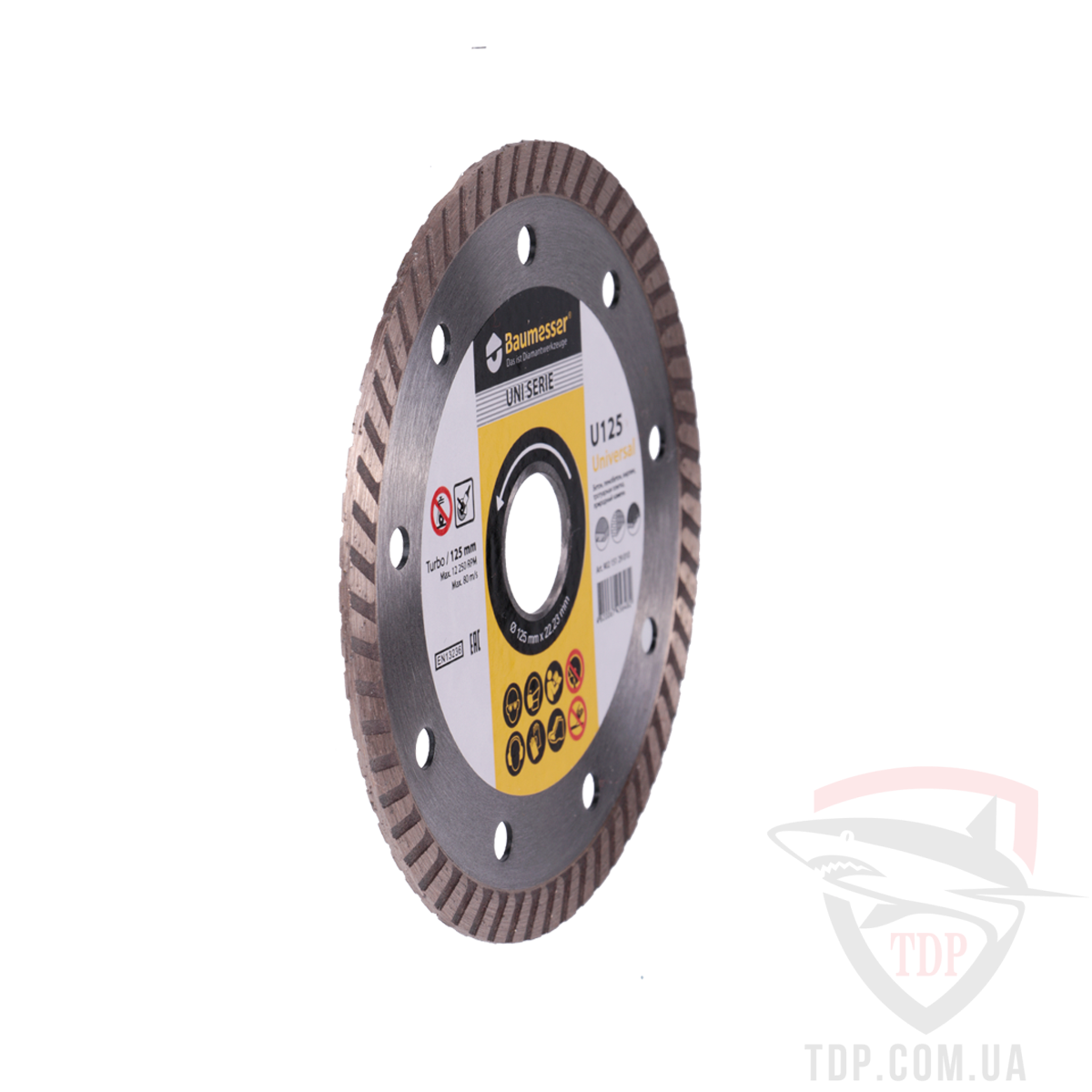 Серія дисків Baumesser Turbo Universal спрямована на вирішення побутових завдань, має широкий спектр матеріалів, що обробляються, і невисоку ціну. Такий диск дозволить вам виконати швидкий різ бетону, у тому числі з невеликим армуванням, цегляну стіну та інші будівельні матеріали. Такий диск замінює великий спектр дорожчих дисків. і дозволяє зробити невеликий ремонт у будинку, або спростити роботу майстрам, де різання подібних матеріалів зустрічається не часто.