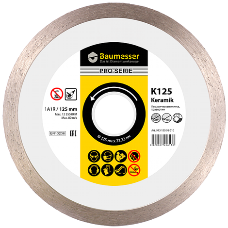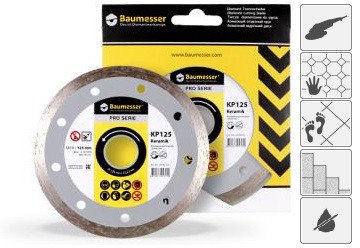 Алмазний диск Baumesser KERAMIK призначений для якісного різання травертину та керамічної плитки без охолодження на кутово-шліфувальній машині.
