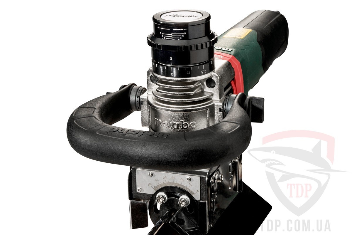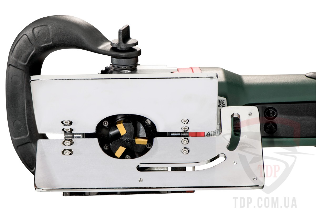Кромковий фрезер Metabo KFM 16-15 F інструмент для фрезерування металу, який дає можливість знімати фаски до 15 мм і призначений для підготовки кромок зварювальних швів. Управління одним натисканням кнопки завдяки запатентованому механізму регулювання фрези без інструменту з кроком 0.1 мм; точки фіксації скорочують час регулювання та запобігають ненавмисному перемиканню глибини фрезерування під час роботи. Точне регулювання кута фаски прямо над напрямними пластинами. Універсальна фрезерна головка з трьома поворотними твердосплавними пластинами для зняття фасок під будь-яким кутом 0-90°.