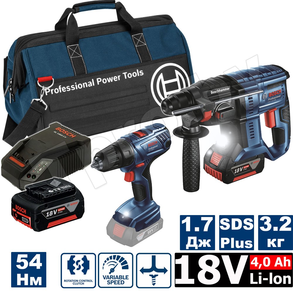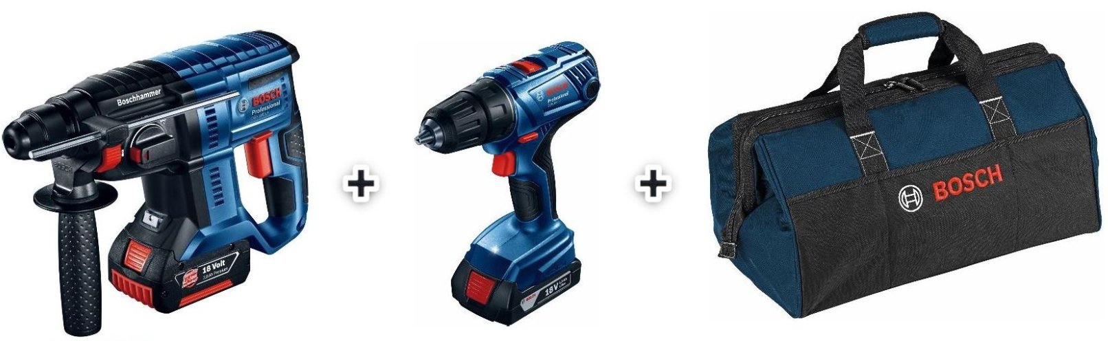 Набір інструментів Bosch GSR 180 Li 06019F8102 компанія BOSCH вирішила порадувати своїх клієнтів промо-набором, який включає акумуляторний перфоратор і акумуляторний дриль-шуруповерт плюс зручна сумка для інструментів.