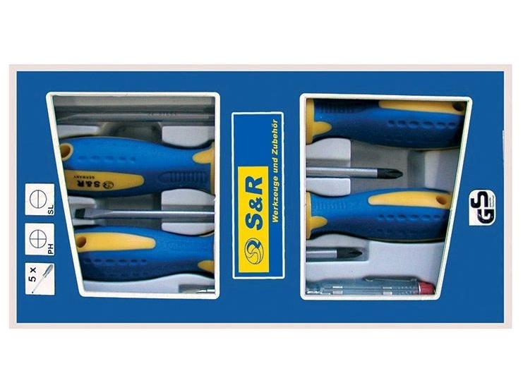 Набір викруток для ручного вкручування або викручування кріпильних елементів та різьбових з'єднань. Набір складає 4 викрутки та додатковий прилад для обчислення фази. Головна особливість даних викруток - це якість твору, а саме сталевий матеріал з якого виготовлено основи та наконечник. Стрижень викрутки має тверду майнову структуру сталі марки S2. Викрутки виготовлена з загартованої сталі зі спеціальним способом безпосереднього вливання в три етапи жала викрутки в рукоятку, такий підхід до виготовлення, виділяє викрутки виробництва S&R. Жало пройшло високочастотне загартування, воно обладнане магнітом і вкрите фосфатом. Рукоятка викрутка відповідає всім вимогам ергономіки та стандартних запитів щодо комфорту, стрижень має хромове покриття, яке захистить його від впливу корозії.
