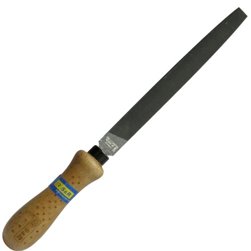 Напильник плоский звужений S&R для обпилювання широких поверхонь, зняття задирок, обпилювання пазів та отворів різних металевих виробів. Напилок має драчеву насічку, яка нанесена на його робочі грані. Рукоятка виготовлена з дерева, її форма розроблена з урахуванням ергономічності для комфортного використання за тривалої інтенсивної роботи. виготовлений із сталі з великим вмістом вуглецю так що можна не турбуватися за швидке зношування полотна.