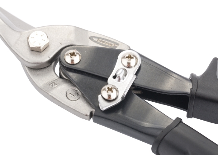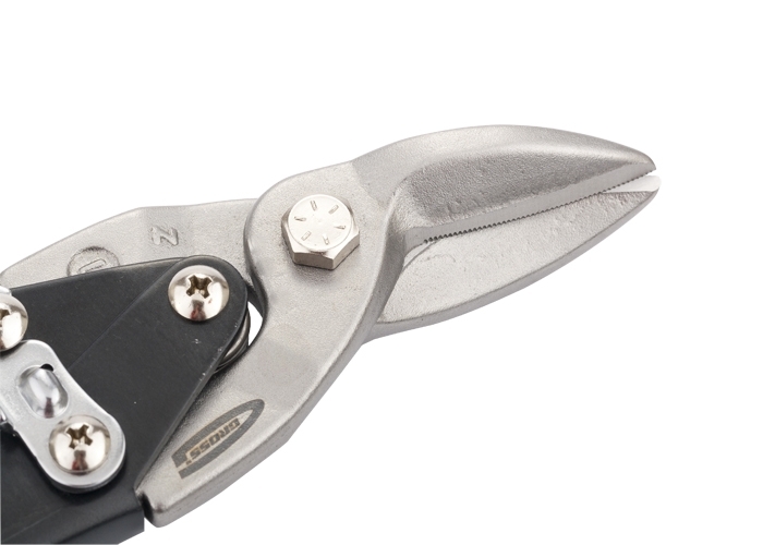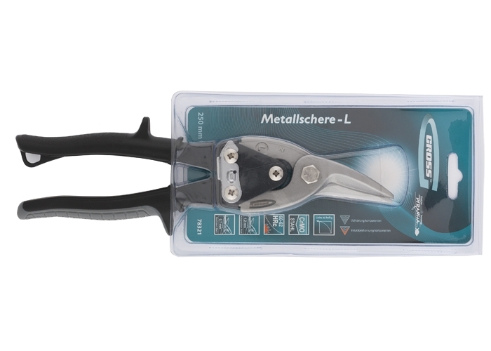 Ножиці по металу торгової марки Gross призначені для точного прямого та лівого різання листового металу завтовшки до 1.2 мм та нержавіючої сталі завтовшки до 0.7 мм. Робочі частини ножиць виготовлені з високолегованої сталі (CrMo), вміст молібдену та ванадію у її складі додає необхідної жорсткості та високої твердості. Ріжучі губки проходять процес індукційного загартування та мають твердість 62 HRc. Ножиці загальною довжиною 250 мм оснащені ергономічними двокомпонентними ручками, оригінальна форма яких знижує ризик травматизму та забезпечує зручність при тривалих роботах.
