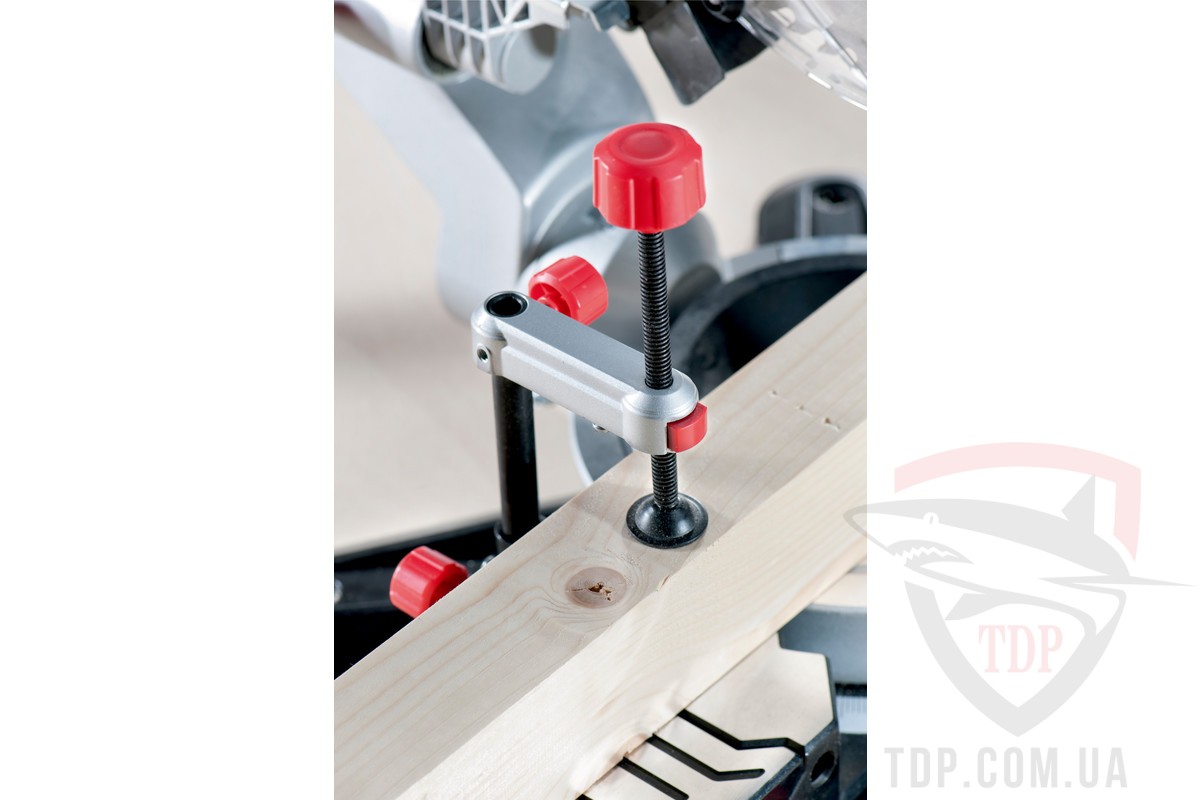 Торцювальна пилка оснащена двигуном потужністю 1200 Вт, який забезпечує продуктивну роботу на швидкості 5000 об/хв. Як робоче оснащення використовуються пиляльні диски діаметром 216 мм з посадковим отвором 30 мм. Для легкої та безпечної заміни пильного диска інструмент обладнаний блокуванням шпинделя. Пильна голова нахиляється вліво і має додаткову кутову зону заднього розпилу. Глибина пропилу під кутом 90 ° становить 65 мм, а під кутом 45 ° - 36 мм.
