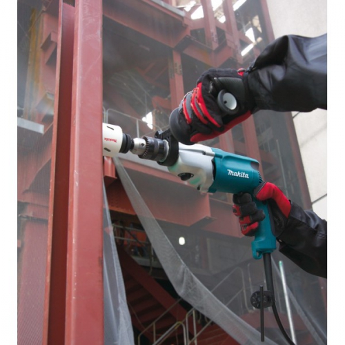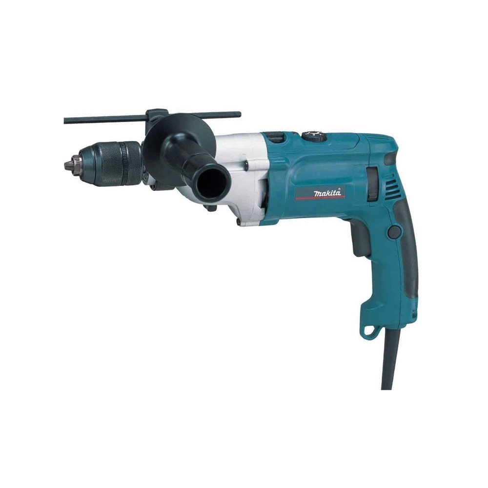 Обладнана реверсом нового покоління. Конструкція влаштована так, щоб дриль було зручно тримати у руці. Ударний дриль оснащений індикаторами несправностей та пошкоджень. В наявності фіксатор кнопки вимкнення - забезпечить безперервну роботу. Ручка прогумована, не ковзає та поглинає вібрацію під час роботи. Швидкозатискний патрон - швидка заміна насадок. В комплекті валіза та бічна рукоять. Кейс допоможе при транспортуванні ударного дриля. Бічна рукоять дозволить працювати двома руками. Для забезпечення безпеки Makita HP2071 має спеціальну муфту. Також в комплект входить обмежувач глибини, завдяки якому користувач точно просвердлить отвір потрібної глибини.