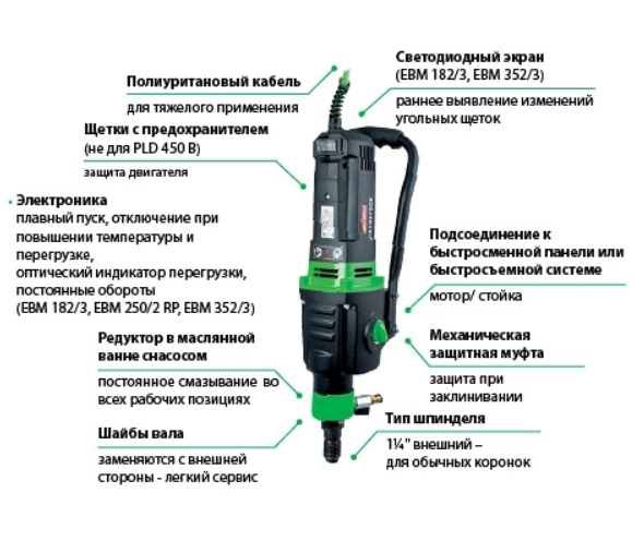 Невеликий розмір агрегату і вага 20,9 кілограма не займе багато сил при перевезенні. PLE 160 надає використання коронки з діаметром від 12 до 202 мм. Виробник допоміг продовжити службу виробу тим, що робочі частини редуктора постійно змащуються маслом, яке подає насос. Оператор такого бура буде щасливим, оскільки кнопки управління захищені від пилу та бризок. Постачання даного апарату йде разом з посиленою похилою стійкою, з нею можливе свердління під кутом 45 градусів.
